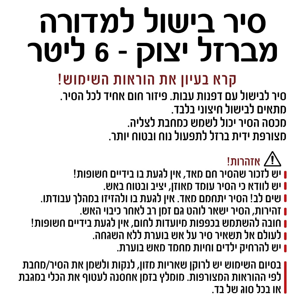 שים לב! הסיר יתחמם מאד. אין לגעת בו ולהזיזו במהלך עבודתו. בסיום השימוש יש לרוקן שאריות מזון, לנקות ולשמן את הסיר / מחבת לפי ההוראות המצורפות